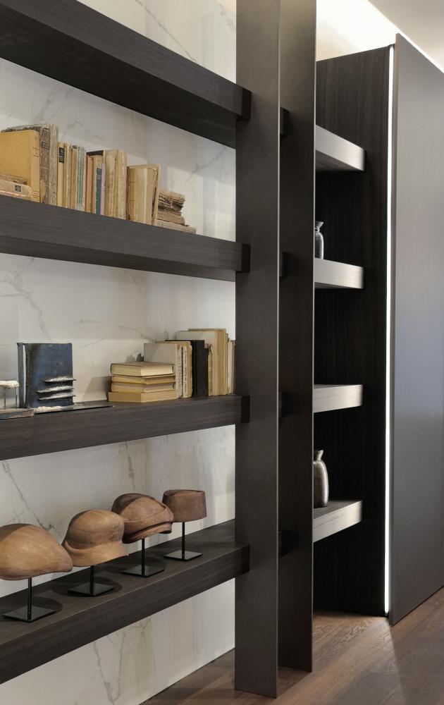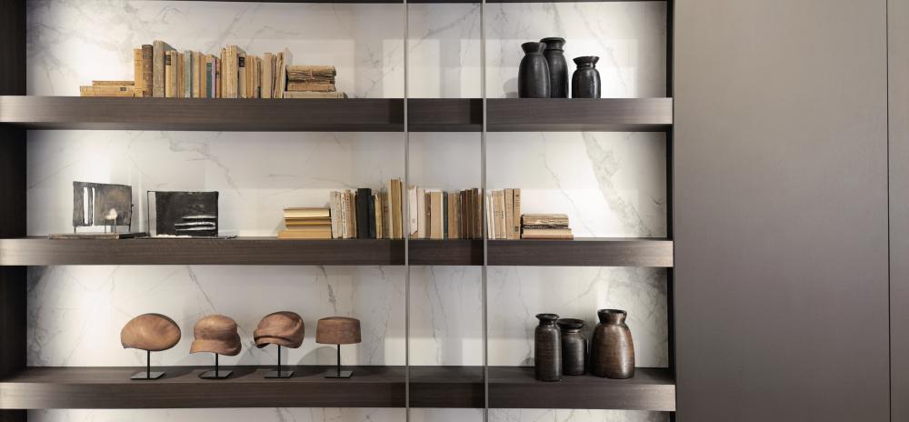 L’anta Blade sporgente e scansata, avvolge il piano di lavoro della cucina adiacente, conferendo al tutto un’eleganza sofisticata.