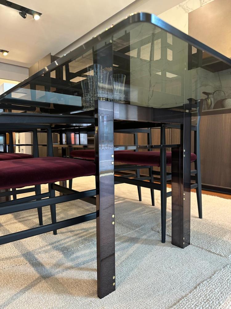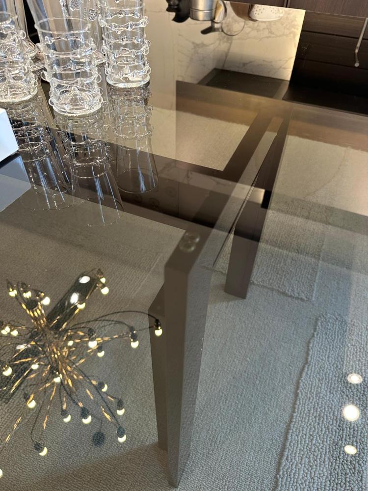 La base architettonica in alluminio o in acciaio, definita da profili piatti con spessore accentuato, costituisce la parte essenziale di questo iconico tavolo con piano in vetro, dove l’eleganza raffinata della base diventa protagonista attraverso la trasparenza del piano.