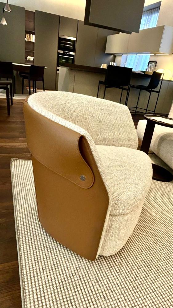 Caratteristica distintiva della poltrona Ozzy, come degli omonimi pouf e poltroncina, è lo schienale esterno rivestito in cuoio che si abbina, in una pluralità di raffinate combinazioni, al rivestimento della seduta, proposto nelle versioni pelle e tessuto. Poggiata a terra su un basamento girevole in metallo, la poltrona accoglie soffici cuscini in piuma d’oca, che conferiscono eleganza ed elevato comfort alla seduta.