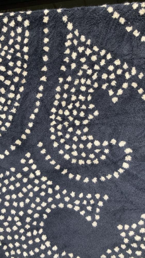 Tappeto nero in lana taftata con disegni bianchi in pura lana della Nuova Zelanda, tinti con colori atossici, tessuti a mano su telai tradizionali Indian